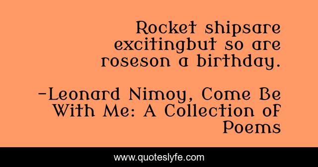 This page presents the quote "Rocket shipsare excitingbut so are roseson a birthday.". Author of this quote is Leonard Nimoy, Come Be With Me: A Collection of Poems. This quote is about genius, space-exploration, poetry,.