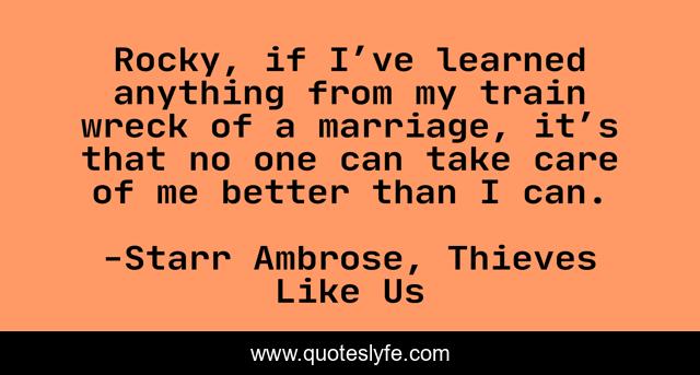 This page presents the quote "Rocky, if I’ve learned anything from my train wreck of a marriage, it’s that no one can take care of me better than I can.". Author of this quote is Starr Ambrose, Thieves Like Us. This quote is about marriage, self-sufficiency,.
