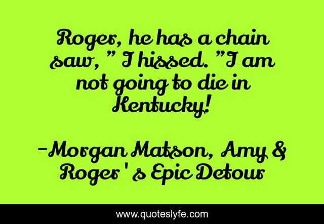 This page presents the quote "Roger, he has a chain saw, " I hissed. "I am not going to die in Kentucky!". Author of this quote is Morgan Matson, Amy & Roger's Epic Detour. This quote is about amy-and-roger-s-epic-detour, humor,.
