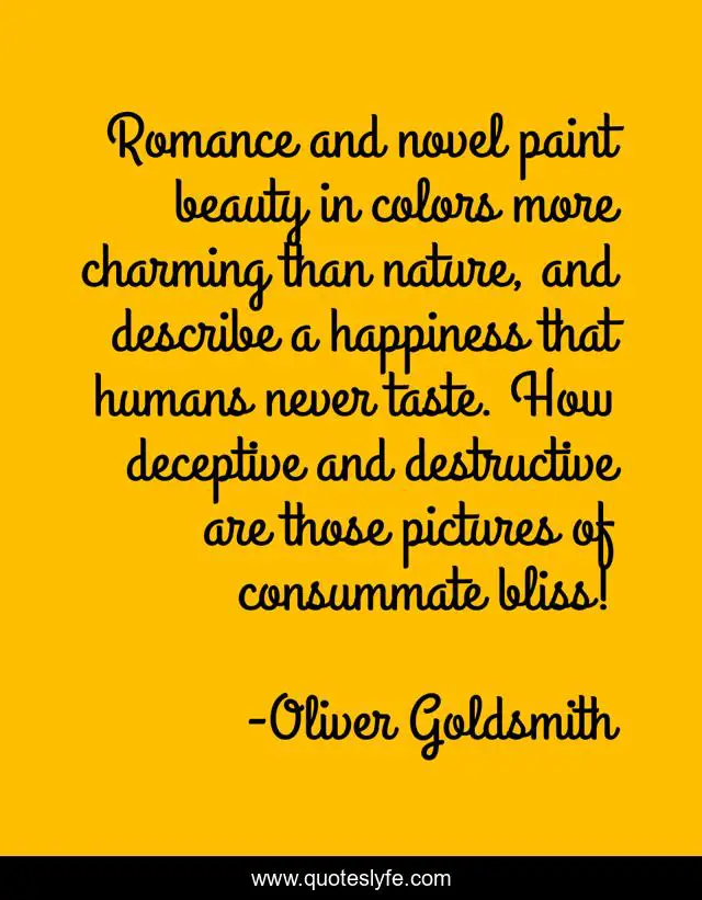 This page presents the quote "Romance and novel paint beauty in colors more charming than nature, and describe a happiness that humans never taste. How deceptive and destructive are those pictures of consummate bliss!". Author of this quote is Oliver Goldsmith. This quote is about colors, beauty, nature,.