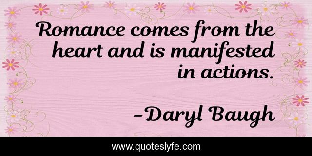 This page presents the quote "Romance comes from the heart and is manifested in actions.". Author of this quote is Daryl Baugh. This quote is about romance, heart, love, actions, affection,.