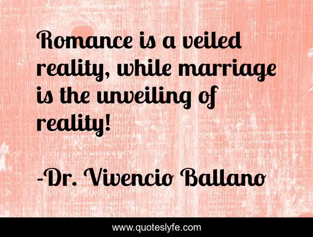 This page presents the quote "Romance is a veiled reality, while marriage is the unveiling of reality!". Author of this quote is Dr. Vivencio Ballano. This quote is about love, marraige, romance, inspirational, enthusiasm, reality, affection,.