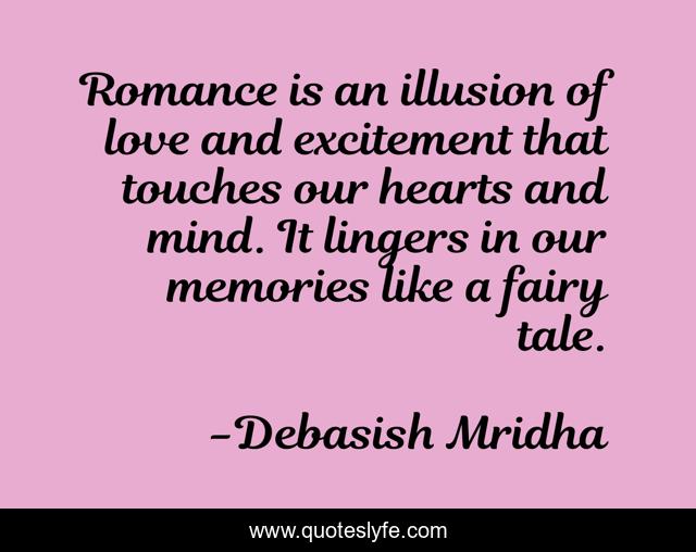 This page presents the quote "Romance is an illusion of love and excitement that touches our hearts and mind. It lingers in our memories like a fairy tale.". Author of this quote is Debasish Mridha. This quote is about lingers-in-our-memories, romance-is-an-illusion-of-love, philosophy, debasish-mridha, romance, quotes, debasish-mridha-md, inspirational, enthusiasm,.