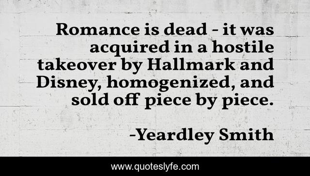 This page presents the quote "Romance is dead - it was acquired in a hostile takeover by Hallmark and Disney, homogenized, and sold off piece by piece.". Author of this quote is Yeardley Smith. This quote is about off, hostile, dead,.