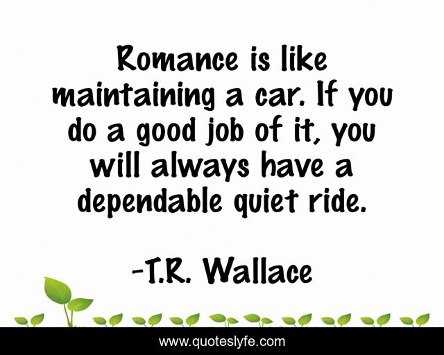 This page presents the quote "Romance is like maintaining a car. If you do a good job of it, you will always have a dependable quiet ride.". Author of this quote is T.R. Wallace. This quote is about romance, humor, whimsy,.