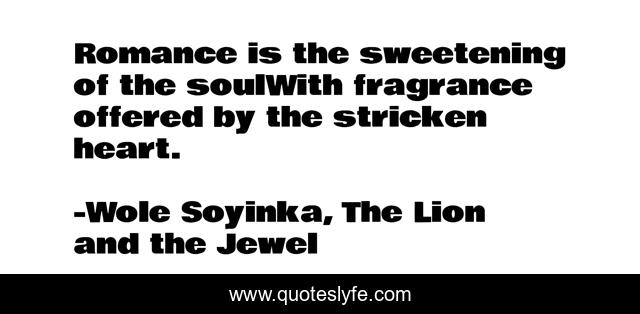 This page presents the quote "Romance is the sweetening of the soulWith fragrance offered by the stricken heart.". Author of this quote is Wole Soyinka, The Lion and the Jewel. This quote is about romance, heart, soul,.