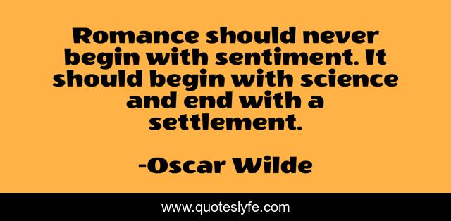 This page presents the quote "Romance should never begin with sentiment. It should begin with science and end with a settlement.". Author of this quote is Oscar Wilde. .