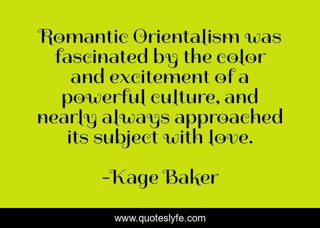 This page presents the quote "Romantic Orientalism was fascinated by the color and excitement of a powerful culture, and nearly always approached its subject with love.". Author of this quote is Kage Baker. This quote is about culture, love, powerful, affection,.