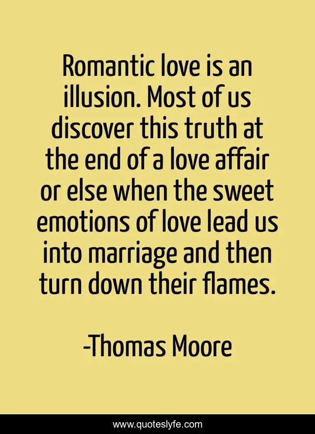 This page presents the quote "Romantic love is an illusion. Most of us discover this truth at the end of a love affair or else when the sweet emotions of love lead us into marriage and then turn down their flames.". Author of this quote is Thomas Moore. This quote is about marriage, romantic, truth,.