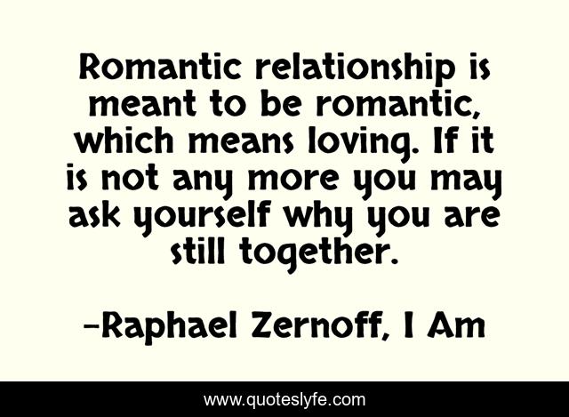 This page presents the quote "Romantic relationship is meant to be romantic, which means loving. If it is not any more you may ask yourself why you are still together.". Author of this quote is Raphael Zernoff, I Am. This quote is about love, romantic, relationship, together, choices, wisdom, affection,.