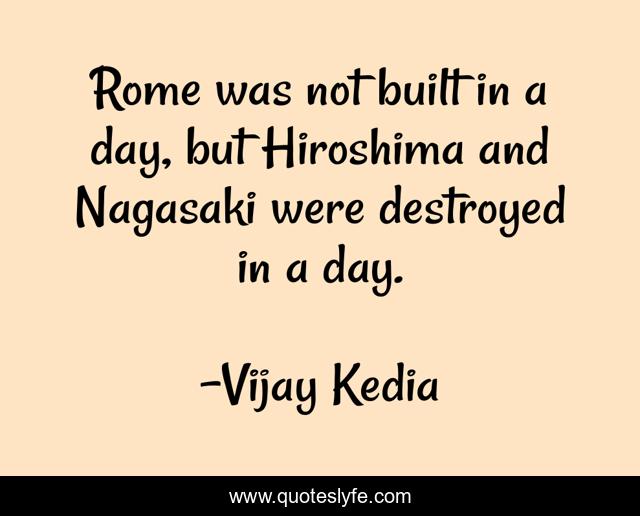 This page presents the quote "Rome was not built in a day, but Hiroshima and Nagasaki were destroyed in a day.". Author of this quote is Vijay Kedia. This quote is about business-success, business-advice, business, business-leaders, stock-market, inspirational, enthusiasm,.