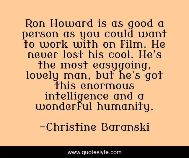 This page presents the quote "Ron Howard is as good a person as you could want to work with on film. He never lost his cool. He's the most easygoing, lovely man, but he's got this enormous intelligence and a wonderful humanity.". Author of this quote is Christine Baranski. This quote is about work, good, humanity,.