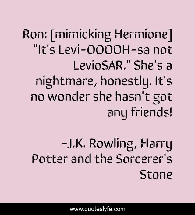 This page presents the quote "Ron: [mimicking Hermione] "It's Levi-OOOOH-sa not LevioSAR." She's a nightmare, honestly. It's no wonder she hasn't got any friends!". Author of this quote is J.K. Rowling, Harry Potter and the Sorcerer's Stone. .