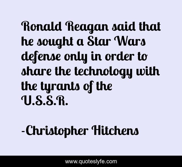 This page presents the quote "Ronald Reagan said that he sought a Star Wars defense only in order to share the technology with the tyrants of the U.S.S.R.". Author of this quote is Christopher Hitchens. This quote is about said, star, order,.