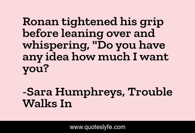 This page presents the quote "Ronan tightened his grip before leaning over and whispering, "Do you have any idea how much I want you?". Author of this quote is Sara Humphreys, Trouble Walks In. This quote is about police-romance, contemporary-romance, romantic-suspense,.