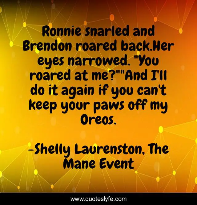This page presents the quote "Ronnie snarled and Brendon roared back.Her eyes narrowed. "You roared at me?""And I'll do it again if you can't keep your paws off my Oreos.". Author of this quote is Shelly Laurenston, The Mane Event. This quote is about shifters, brendan, pride, ronnie,.