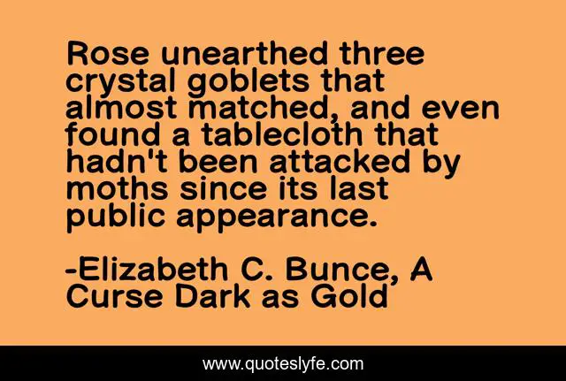 This page presents the quote "Rose unearthed three crystal goblets that almost matched, and even found a tablecloth that hadn't been attacked by moths since its last public appearance.". Author of this quote is Elizabeth C. Bunce, A Curse Dark as Gold. This quote is about funny, tablecloth, comedy, moth-eaten, goblet,.