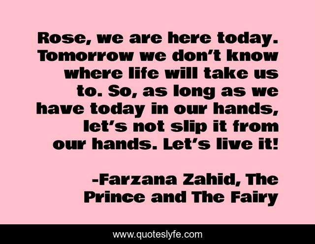 This page presents the quote "Rose, we are here today. Tomorrow we don’t know where life will take us to. So, as long as we have today in our hands, let’s not slip it from our hands. Let’s live it!". Author of this quote is Farzana Zahid, The Prince and The Fairy. This quote is about heart, love, bookworm, prince, note, lovers, rose, romance, wattpadlife,.