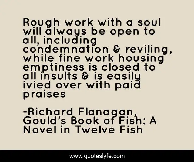 This page presents the quote "Rough work with a soul will always be open to all, including condemnation & reviling, while fine work housing emptiness is closed to all insults & is easily ivied over with paid praises". Author of this quote is Richard Flanagan, Gould's Book of Fish: A Novel in Twelve Fish. This quote is about art, commercialization, creativity, inspirational, enthusiasm,.