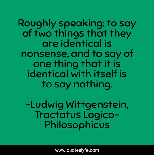 This page presents the quote "Roughly speaking: to say of two things that they are identical is nonsense, and to say of one thing that it is identical with itself is to say nothing.". Author of this quote is Ludwig Wittgenstein, Tractatus Logico-Philosophicus. This quote is about identical, philosophy, identity, logic,.