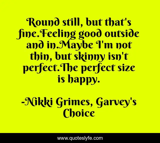 This page presents the quote "Round still, but that's fine.Feeling good outside and in.Maybe I'm not thin, but skinny isn't perfect.The perfect size is happy.". Author of this quote is Nikki Grimes, Garvey's Choice. .
