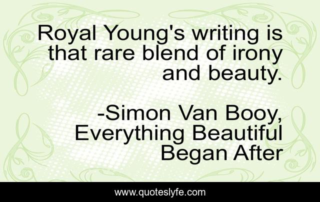 This page presents the quote "Royal Young's writing is that rare blend of irony and beauty.". Author of this quote is Simon Van Booy, Everything Beautiful Began After. This quote is about simon-van-booy, beauty, irony, british, romance, celebrity, fame,.