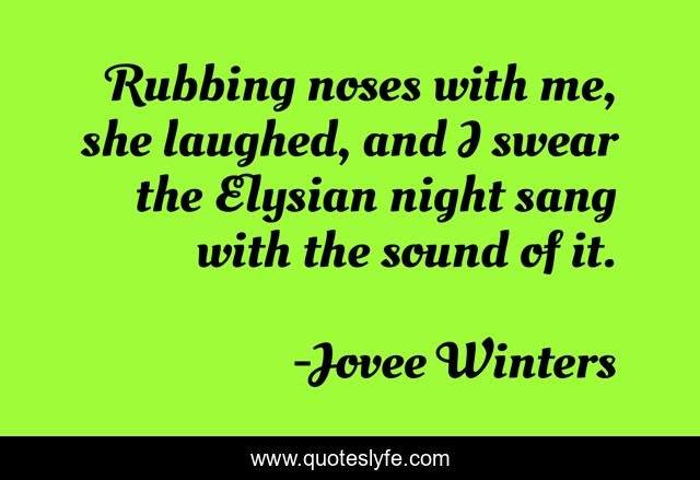 This page presents the quote "Rubbing noses with me, she laughed, and I swear the Elysian night sang with the sound of it.". Author of this quote is Jovee Winters. This quote is about goddess, love, noses, god, elysian, hades, immortal, romance, jovee-winters,.