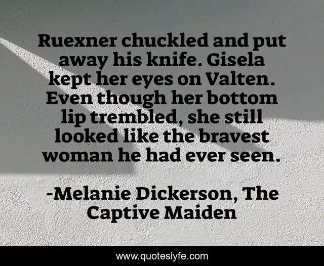 This page presents the quote "Ruexner chuckled and put away his knife. Gisela kept her eyes on Valten. Even though her bottom lip trembled, she still looked like the bravest woman he had ever seen.". Author of this quote is Melanie Dickerson, The Captive Maiden. This quote is about brave, ruexner, gisela, valten-gerstenberg,.