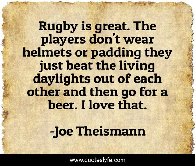 This page presents the quote "Rugby is great. The players don't wear helmets or padding they just beat the living daylights out of each other and then go for a beer. I love that.". Author of this quote is Joe Theismann. This quote is about living, beer, love, affection,.