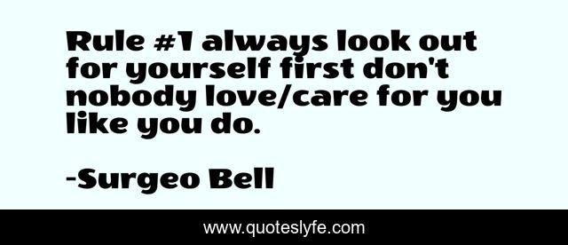 This page presents the quote "Rule #1 always look out for yourself first don't nobody love/care for you like you do.". Author of this quote is Surgeo Bell. This quote is about love, money, sad, making-money, respect, trust, relationships, accomplish, god,.