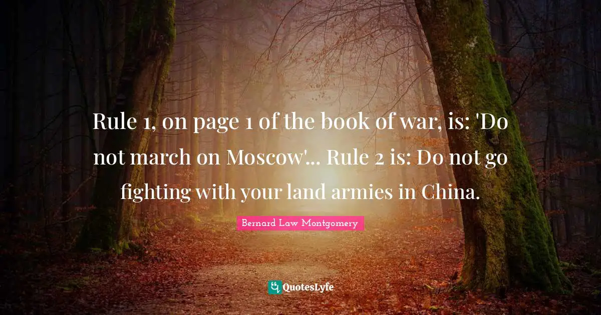 This page presents the quote "Rule 1, on page 1 of the book of war, is: 'Do not march on Moscow'... Rule 2 is: Do not go fighting with your land armies in China.". Author of this quote is Bernard Law Montgomery. This quote is about china, moscow, book, march, fighting, war, land,.