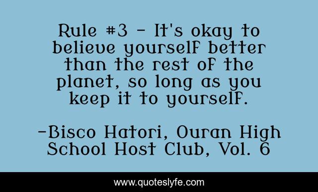 This page presents the quote "Rule #3 - It's okay to believe yourself better than the rest of the planet, so long as you keep it to yourself.". Author of this quote is Bisco Hatori, Ouran High School Host Club, Vol. 6. This quote is about inspirational-life, humor,.
