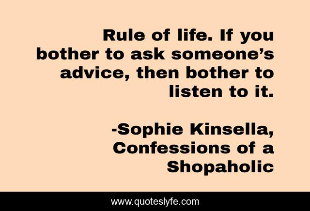 This page presents the quote "Rule of life. If you bother to ask someone’s advice, then bother to listen to it.". Author of this quote is Sophie Kinsella, Confessions of a Shopaholic. This quote is about advice, humor, life,.