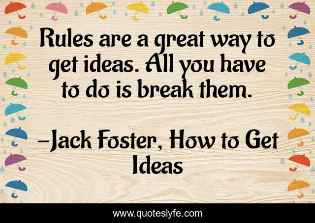 This page presents the quote "Rules are a great way to get ideas. All you have to do is break them.". Author of this quote is Jack Foster, How to Get Ideas. This quote is about rules, creativity, ideas,.