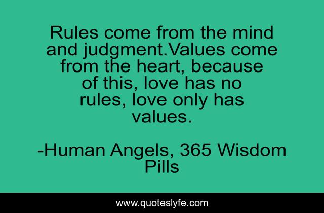This page presents the quote "Rules come from the mind and judgment.Values come from the heart, because of this, love has no rules, love only has values.". Author of this quote is Human Angels, 365 Wisdom Pills. This quote is about inspirational, love, unconditional-love, affection, enthusiasm,.