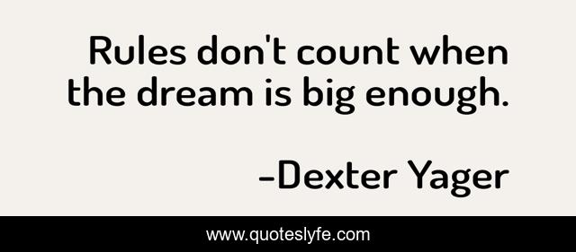 This page presents the quote "Rules don't count when the dream is big enough.". Author of this quote is Dexter Yager. This quote is about enthusiasm, inspirational, success,.