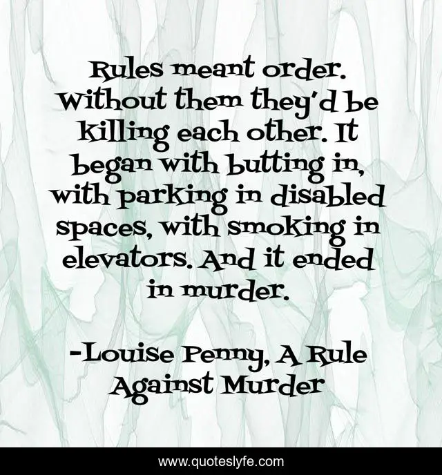 This page presents the quote "Rules meant order. Without them they’d be killing each other. It began with butting in, with parking in disabled spaces, with smoking in elevators. And it ended in murder.". Author of this quote is Louise Penny, A Rule Against Murder. This quote is about rules, breaking-the-rules, murder, order,.