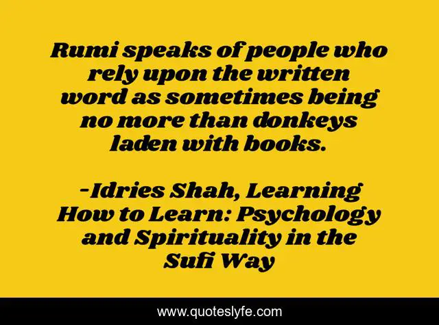 This page presents the quote "Rumi speaks of people who rely upon the written word as sometimes being no more than donkeys laden with books.". Author of this quote is Idries Shah, Learning How to Learn: Psychology and Spirituality in the Sufi Way. This quote is about rumi, literature, psychology, sufism, idries-shah, culture, sufis,.