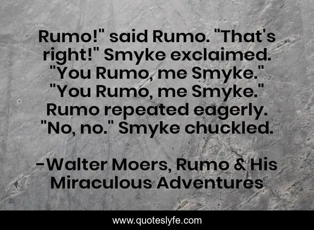 This page presents the quote "Rumo!" said Rumo. "That's right!" Smyke exclaimed. "You Rumo, me Smyke." "You Rumo, me Smyke." Rumo repeated eagerly. "No, no." Smyke chuckled.". Author of this quote is Walter Moers, Rumo & His Miraculous Adventures. This quote is about cute, repeating, comedy, funny,.