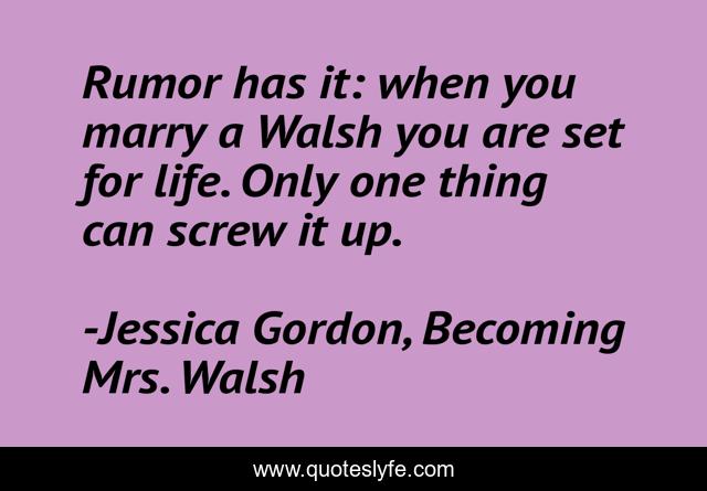 This page presents the quote "Rumor has it: when you marry a Walsh you are set for life. Only one thing can screw it up.". Author of this quote is Jessica Gordon, Becoming Mrs. Walsh. This quote is about women-s-fiction, contemporary-romance, chicklit,.