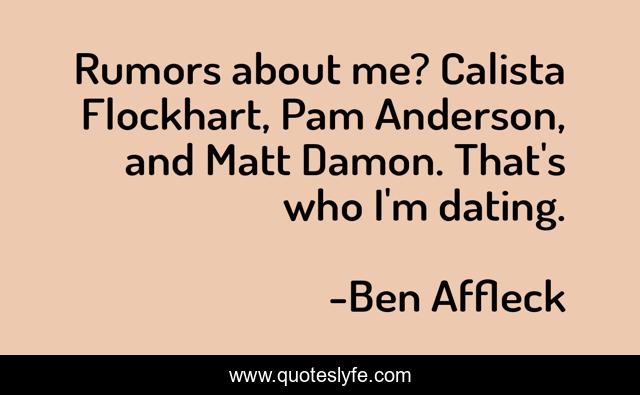 This page presents the quote "Rumors about me? Calista Flockhart, Pam Anderson, and Matt Damon. That's who I'm dating.". Author of this quote is Ben Affleck. This quote is about me, rumors,.