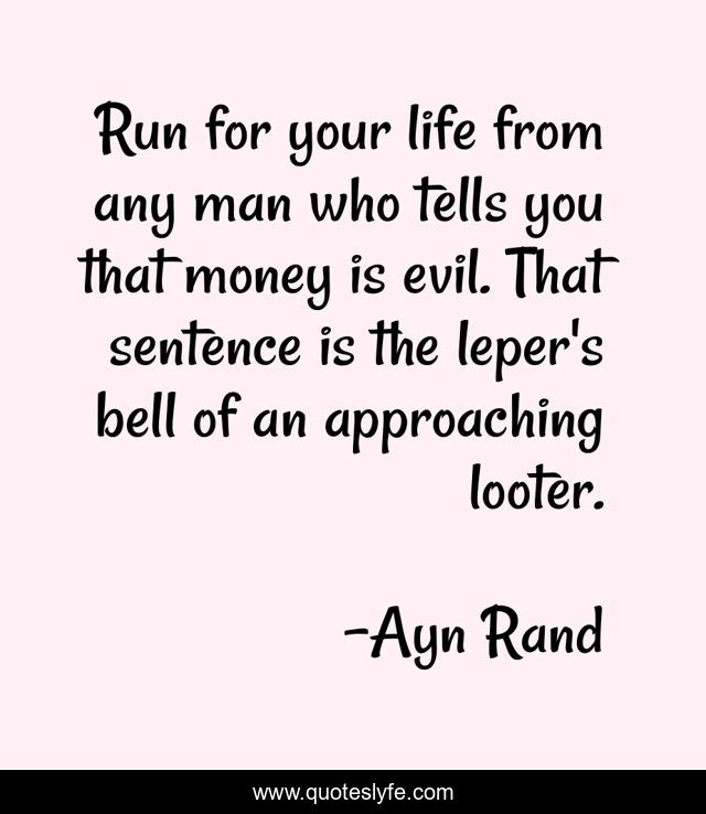 This page presents the quote "Run for your life from any man who tells you that money is evil. That sentence is the leper's bell of an approaching looter.". Author of this quote is Ayn Rand. This quote is about life, evil, man,.