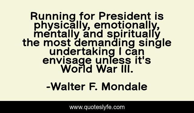 This page presents the quote "Running for President is physically, emotionally, mentally and spiritually the most demanding single undertaking I can envisage unless it's World War III.". Author of this quote is Walter F. Mondale. This quote is about world, single, president,.