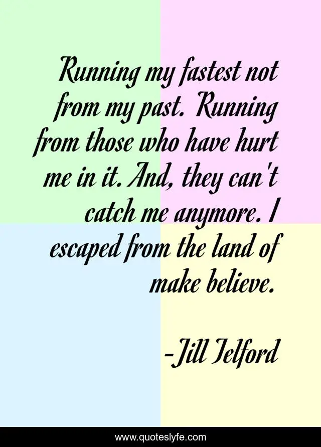 This page presents the quote "Running my fastest not from my past. Running from those who have hurt me in it. And, they can't catch me anymore. I escaped from the land of make believe.". Author of this quote is Jill Telford. This quote is about quotes, believe, runaway, escape,.