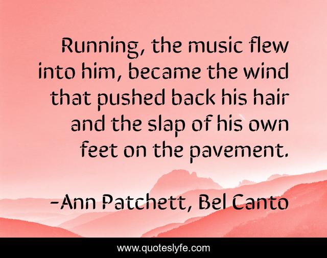 This page presents the quote "Running, the music flew into him, became the wind that pushed back his hair and the slap of his own feet on the pavement.". Author of this quote is Ann Patchett, Bel Canto. This quote is about running, music,.