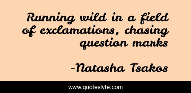 This page presents the quote "Running wild in a field of exclamations, chasing question marks". Author of this quote is Natasha Tsakos. This quote is about thinking, metaphor, curiosity, questioning,.