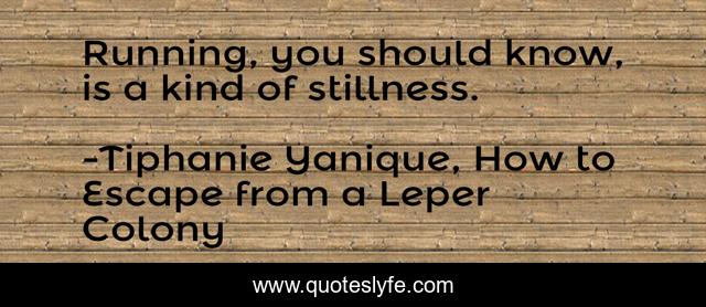 This page presents the quote "Running, you should know, is a kind of stillness.". Author of this quote is Tiphanie Yanique, How to Escape from a Leper Colony. This quote is about running-away, travel,.