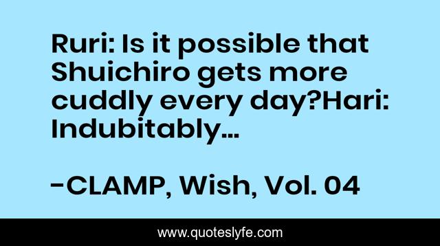 This page presents the quote "Ruri: Is it possible that Shuichiro gets more cuddly every day?Hari: Indubitably...". Author of this quote is CLAMP, Wish, Vol. 04. This quote is about clamp, wish,.