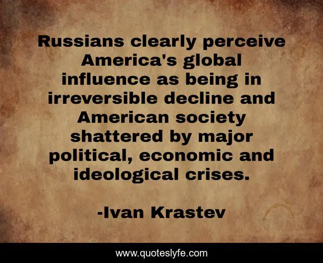 This page presents the quote "Russians clearly perceive America's global influence as being in irreversible decline and American society shattered by major political, economic and ideological crises.". Author of this quote is Ivan Krastev. This quote is about american, america, influence,.
