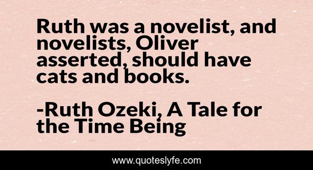 This page presents the quote "Ruth was a novelist, and novelists, Oliver asserted, should have cats and books.". Author of this quote is Ruth Ozeki, A Tale for the Time Being. This quote is about ruth, feminist, japanese, nao, ruth-ozeki, old-jiko, japan, tale-for-the-time-being,.